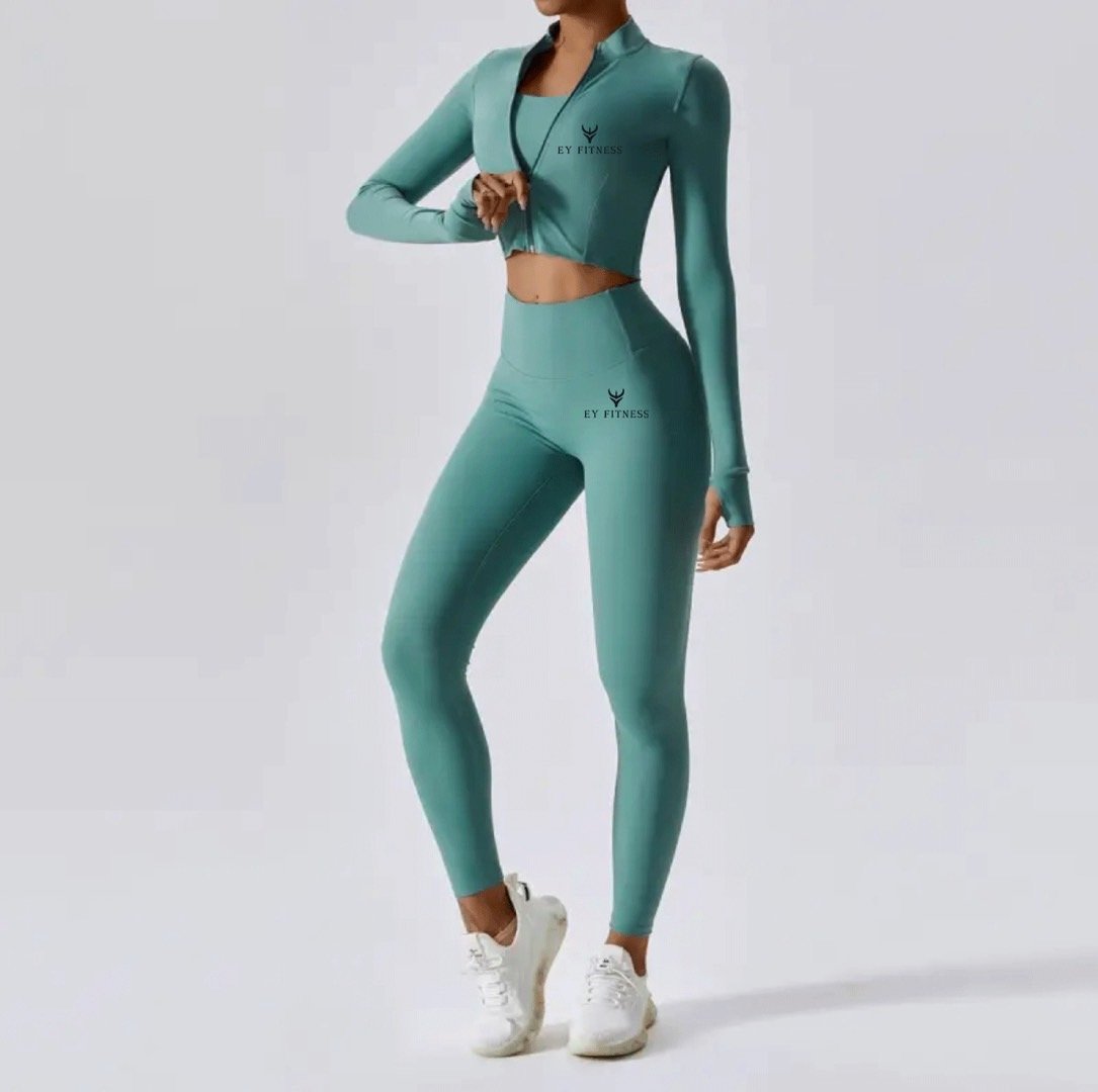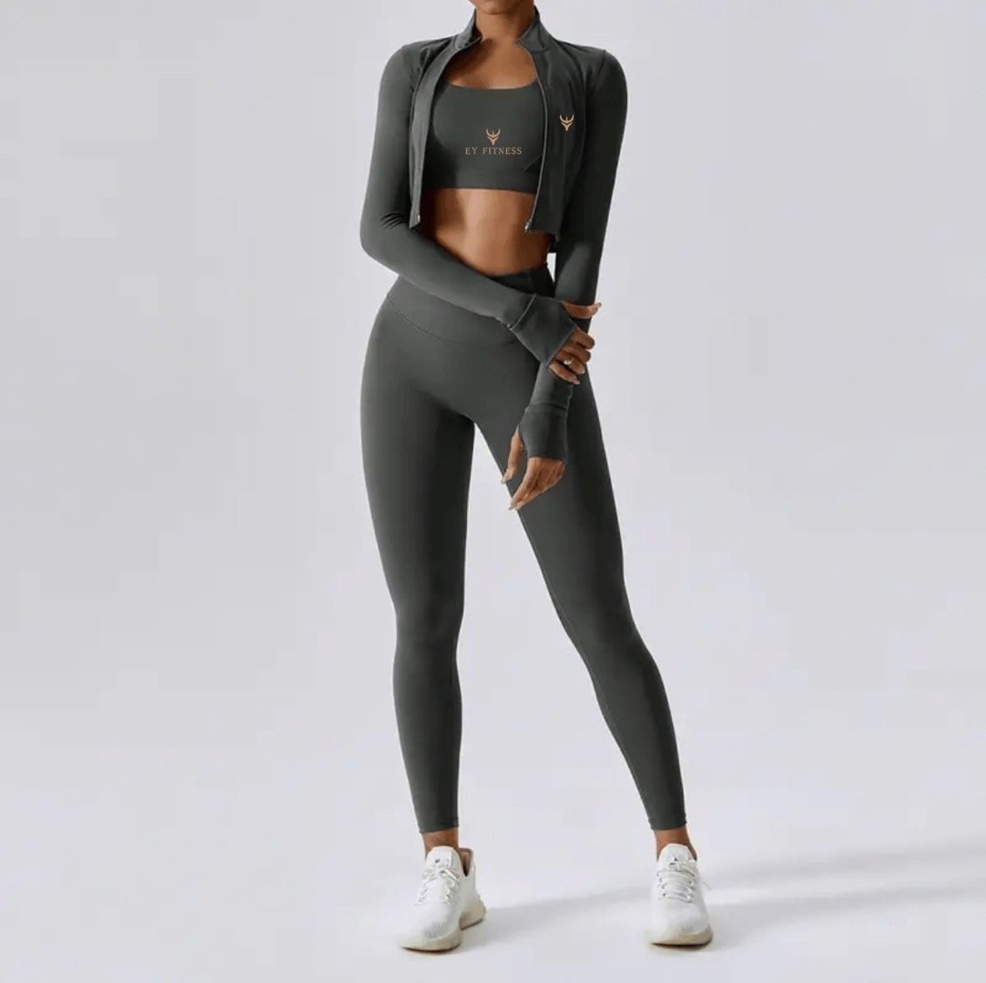This matching 3-piece activewear set features a cropped long-sleeve zip-up jacket, a supportive sports bra, and high-waisted leggings—all designed for comfort and performance. The sleek, form-fitting silhouette flatters your figure while offering full range of motion. Made from soft, breathable fabric with subtle brand detailing, it’s perfect for workouts, yoga, or running errands. Pair with white sneakers for a clean, stylish look that transitions seamlessly from gym to street. Ideal for any active lifestyle seeking both function and fashion.