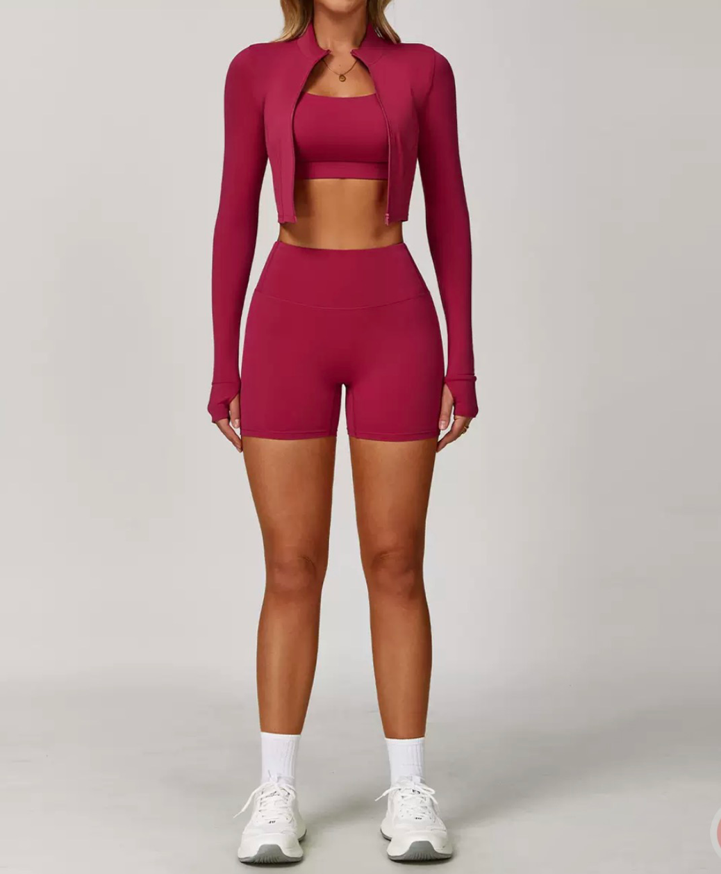 This athletic 3-piece set features a cropped, long-sleeve zip-up jacket with a stand collar, paired with a matching seamless sports bra and high-waisted biker shorts. The form-fitting design offers a sleek, streamlined silhouette perfect for workouts or casual wear. Constructed from a smooth, stretchy fabric, it provides comfort and flexibility for all-day movement. The coordinated pieces create a cohesive, stylish look ideal for the gym, yoga, or running errands.