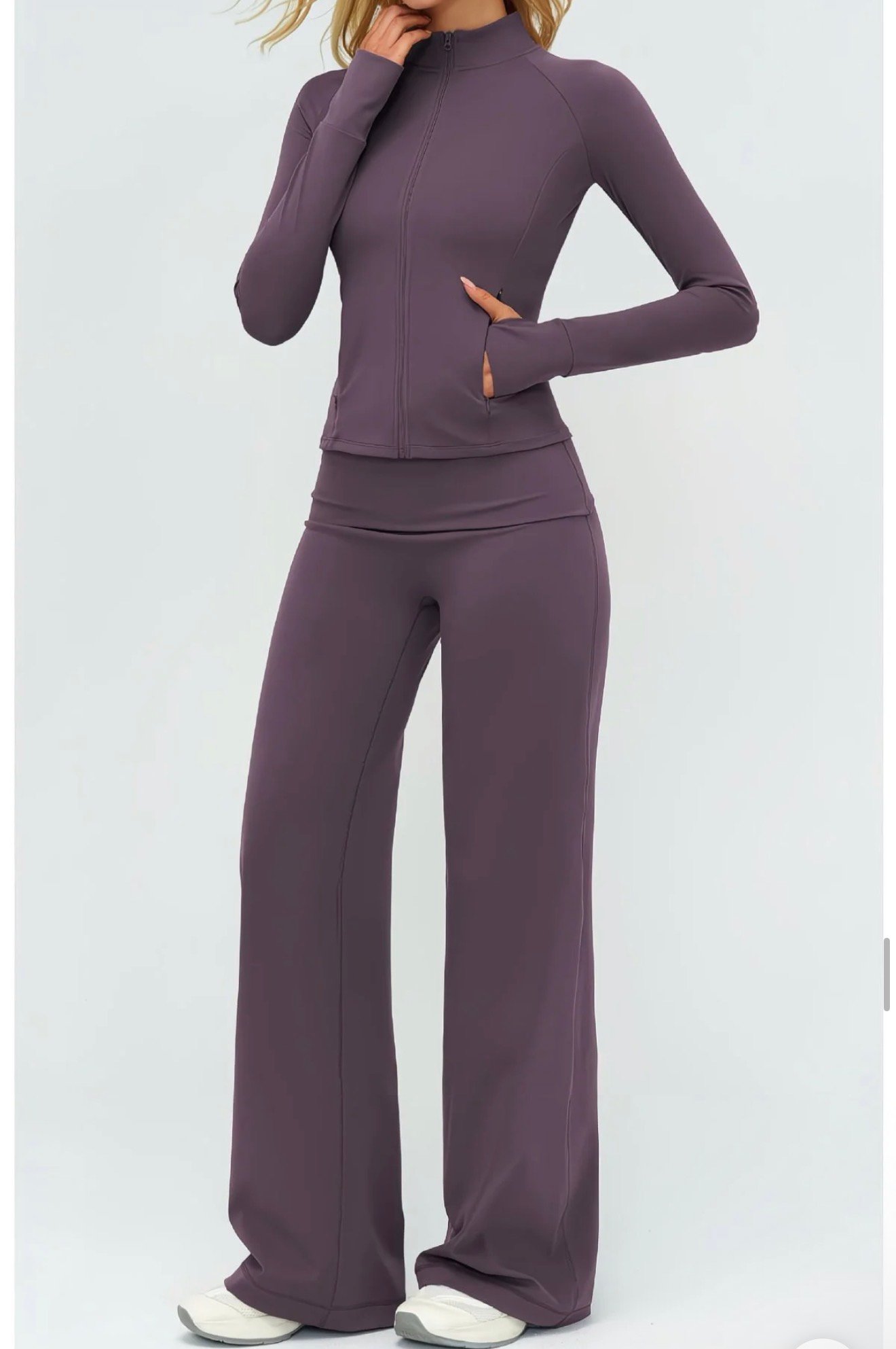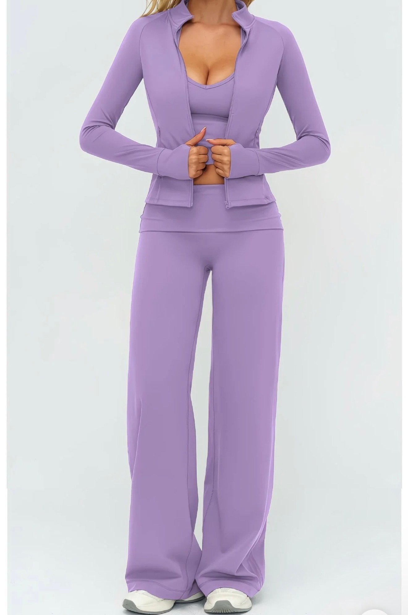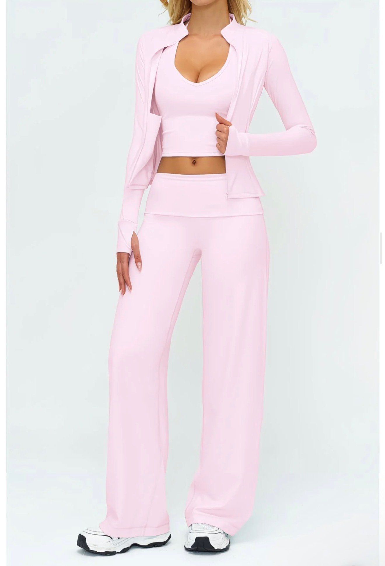 Elevate your activewear with this sleek 3-piece set: a long-sleeve, cropped zip-up jacket with a stand collar, a matching V-neck crop top, and high-waisted wide-leg pants. Crafted from soft, stretchy fabric for comfort and mobility, the flattering fit hugs curves while offering full coverage. Perfect for workouts, yoga, or lounging in style. The seamless design and cohesive look make it ideal for transitioning from studio to street effortlessly.